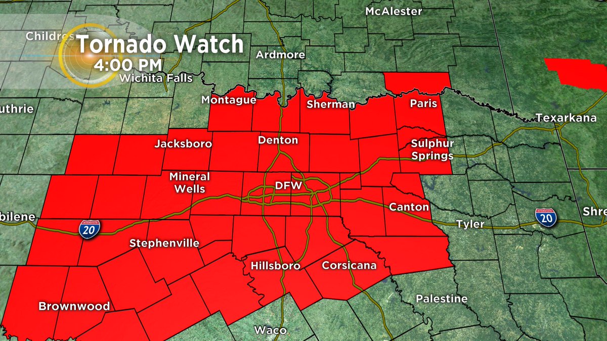 Tornado watch issued for Dallas and most of DFW. What do I do next. If you are currently affected by severe storms you should also be paying attention to a local source of information tv radio etc or have a weather radio because information on this site can be delayed enough that it could cause you to.